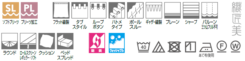 有効巾:100cm◯リピート/ タテ38.0cm ×ヨコ33.3cm ◯組成/ ポリエステル100% ◯日本製 ◯寸法変化率/ 水洗い:タテ-1%・ヨコ-1% ドライ:タテ-1%・ヨコ0% ◯取扱い絵表示/T-A1 オーダーカーテンの縫製についてオーダーカーテンは、カーテンの生地を2倍使用して作った2倍ヒダカーテンと、1.5倍使用した1.5倍ヒダカーテンそして1.3倍使用したフラットカーテンがあります。