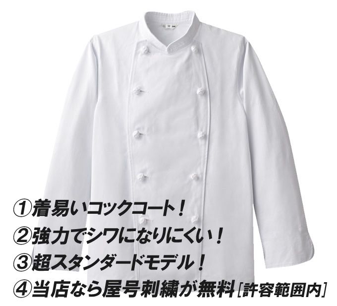 ■商品名:arbe AS-7300 長袖コックコート 男女兼用 ■素材:ツイル(ポリエステル65%、綿35%) ■機能:組紐ボタン、フロント内ポケット ■ポイント:ポリエステル混だから、軽くて、しわになりにくく、乾きやすいコックコート サイズ SS:肩幅 40cm/バスト 100cm/着丈 69cm/そで丈 53cm S:肩幅 42cm/バスト 104cm/着丈 71cm/そで丈 54cm M:肩幅 44cm/バスト 108cm/着丈 73cm/そで丈 56cm L:肩幅 46cm/バスト 112cm/着丈 75cm/そで丈 58cm LL:肩幅 48cm/バスト 116cm/着丈 77cm/そで丈 60cm 3L:肩幅 50cm/バスト 122cm/着丈 77cm/そで丈 60cm 4L:肩幅 52cm/バスト 128cm/着丈 77cm/そで丈 60cm 5L:肩幅 54cm/バスト 134cm/着丈 78cm/そで丈 60cm合わせてこちらもいかがですか?即日発送可能です。