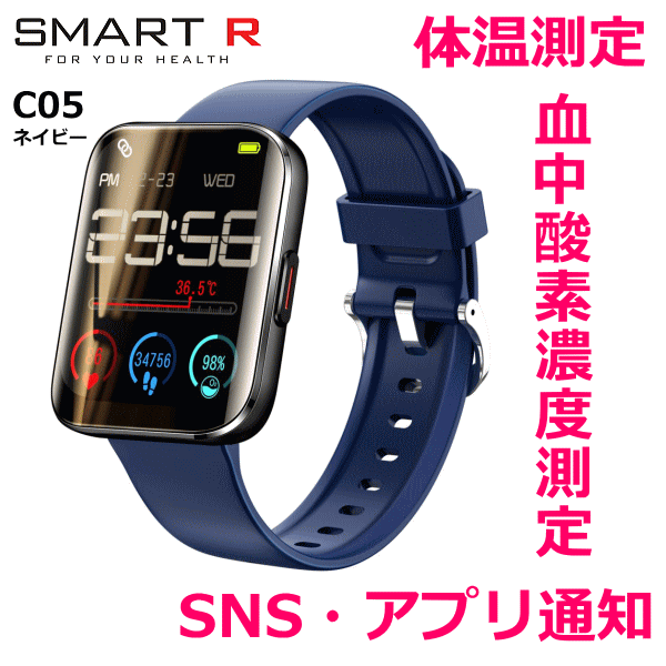 ◆ギフト対応アイコン詳細スマートR/SMART-R 商品詳細機能表面温度測定機能・血中酸素濃度測定機能・時計アナログ表示・防水・アラーム・SNS・アプリ通知・音楽操作・スマホ探し・天気・気温・カメラリモート・歩数・トレーニング・距離・カロリー・心拍・睡眠・座りすぎ注意仕様●充電方式:裏面の金属接点を同梱の充電器の接点に合わせて差し込む、待ち受け約8-15日 充電時間約2時間、画面サイズ1.69インチ 重量49.2g●タッチパネル IP67防水、対 応OS:Android4.4、iOS8.0以 降■ご注意点※ この商品はお取り寄せとなります。